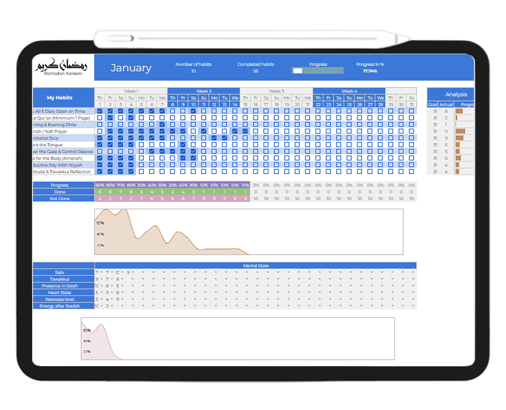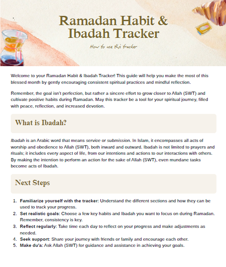 A simple, faith-centred habit tracker to help you stay rounded, focused, and spiritually consistent throughout Ramadan, and beyond.